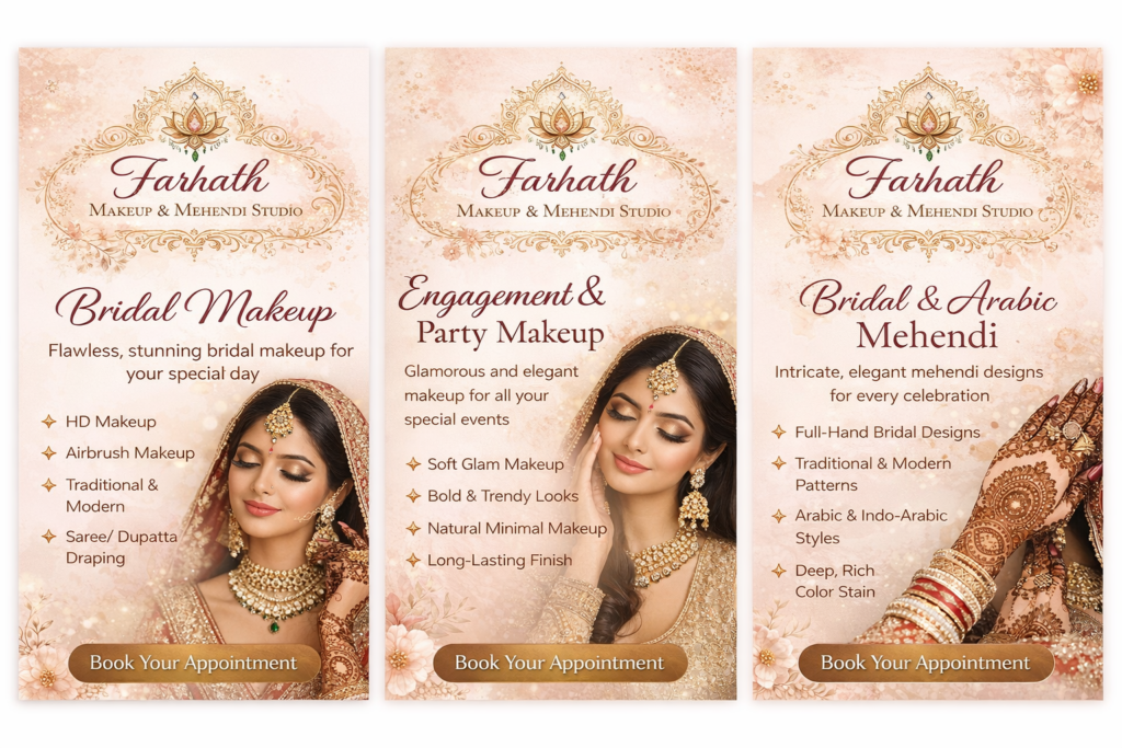 At Farhath Makeup & Mehendi Studio, we offer premium bridal makeup and artistic mehendi services tailored to make your special moments unforgettable.